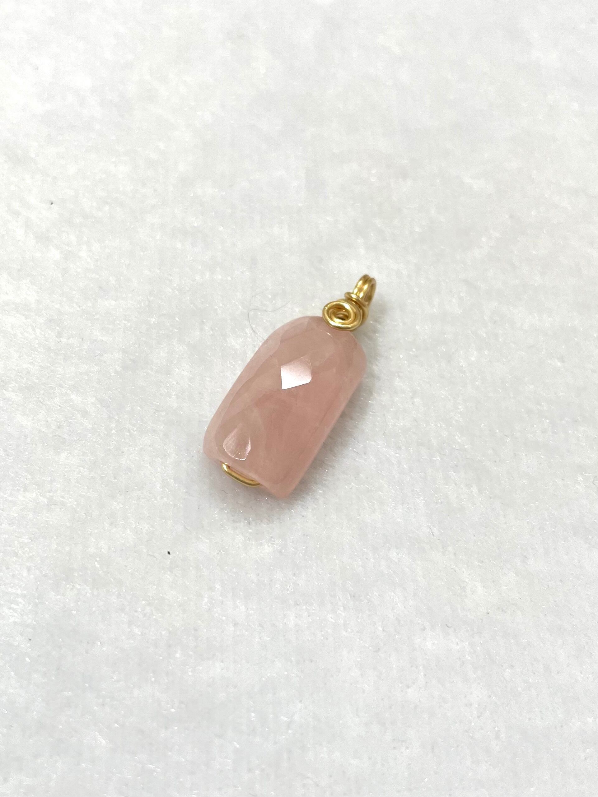 こちらのペンダントトップは、カットが美しいローズクォーツをワイヤーでラッピングした約3センチの長さ(ワイヤー部分含む)になります。