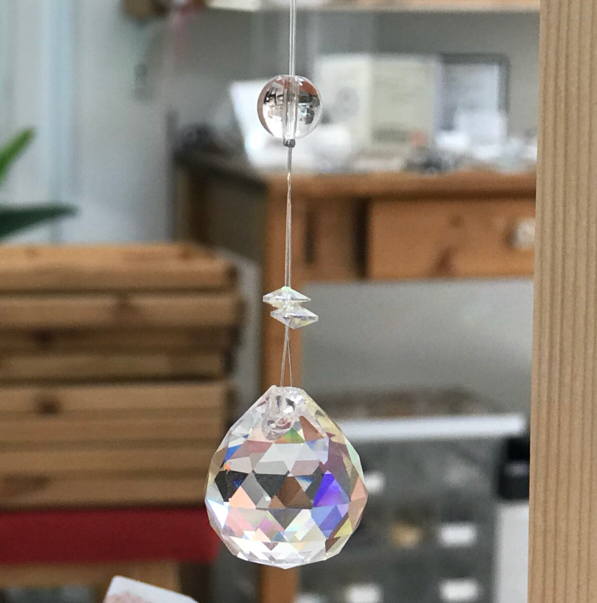 木枠に吊り下げられたガラスミラーボールが太陽の光を浴びて、たくさんの虹のかけらをお部屋中に散りばめます。