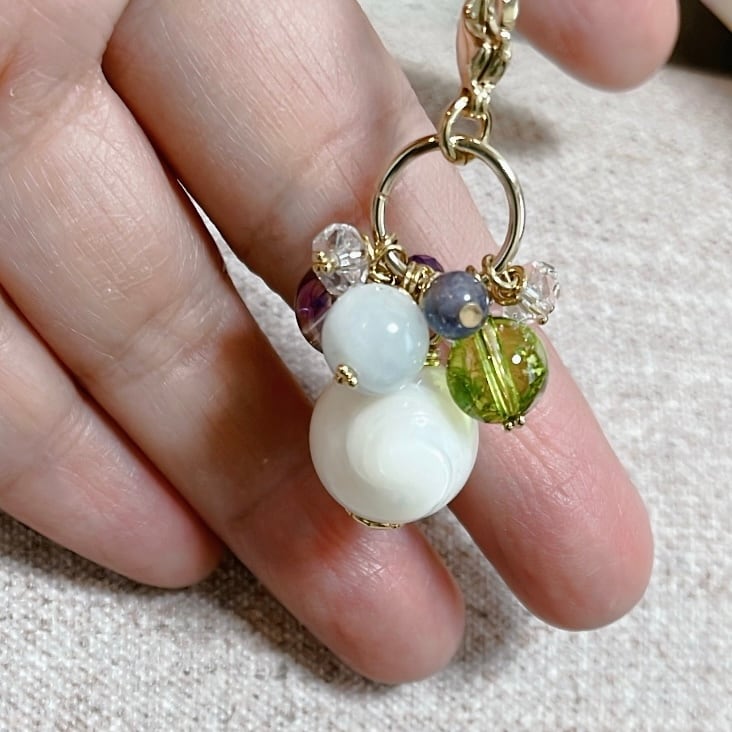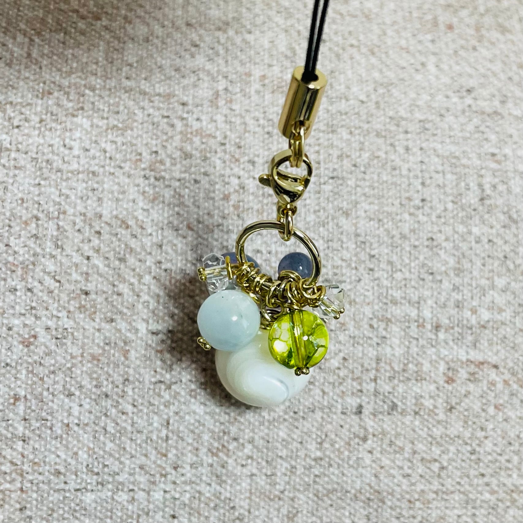 このストラップは、マザーオブパール、ムーンストーン、アメジスト、アイオライト、水晶、クラック水晶(グリーン)、アクアクリスタルといった多彩な天然石を使用した、可愛いデザインが魅力です。小粒の天然石たちが繊細で、どこにでも連れて行きたくなる一品です。